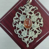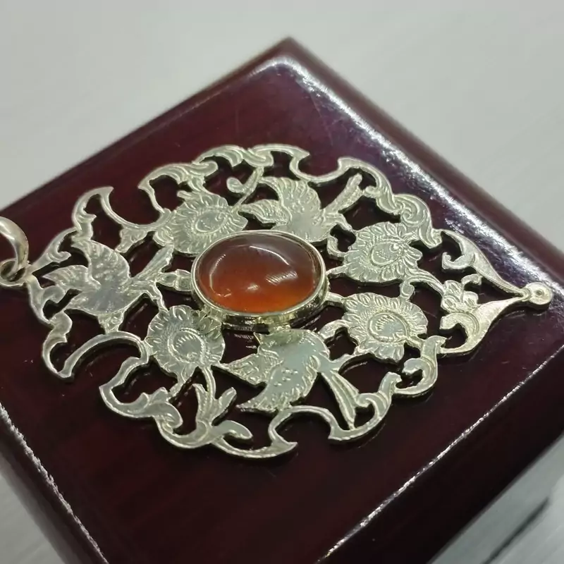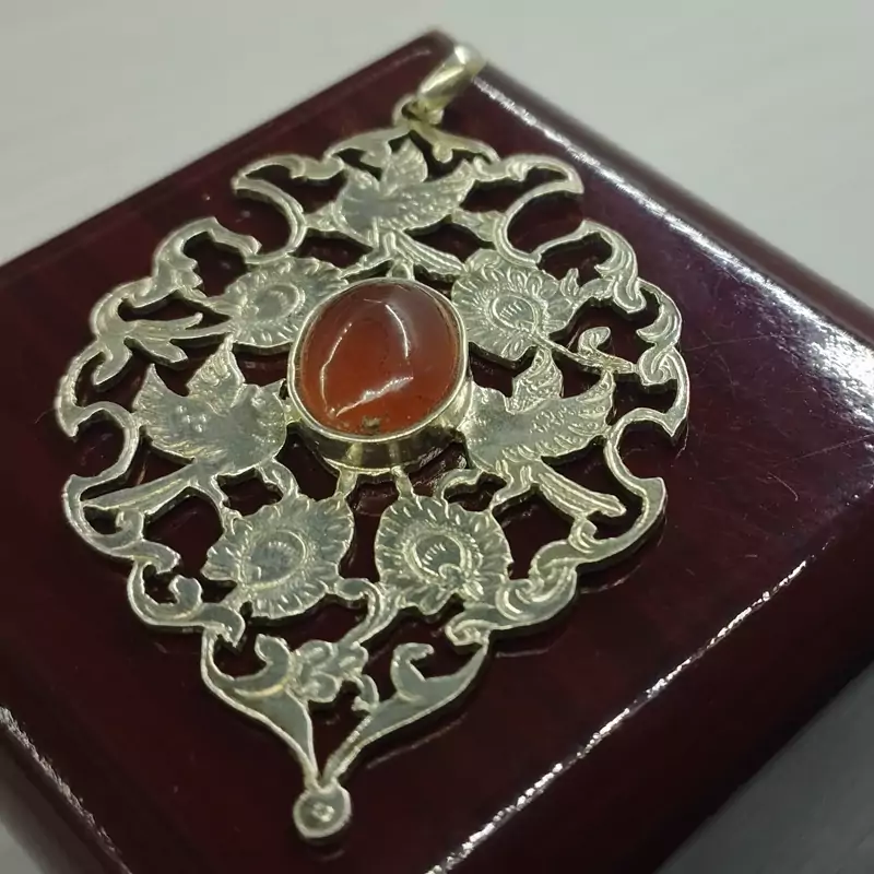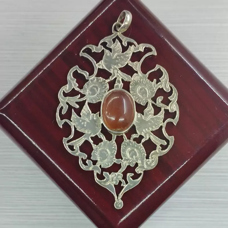 گردن آویز زنانه نقره قلمزنی طرح گل و مرغ عقیق سرخ طبیعی برند دُرسیم