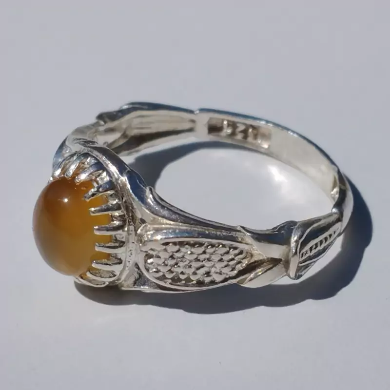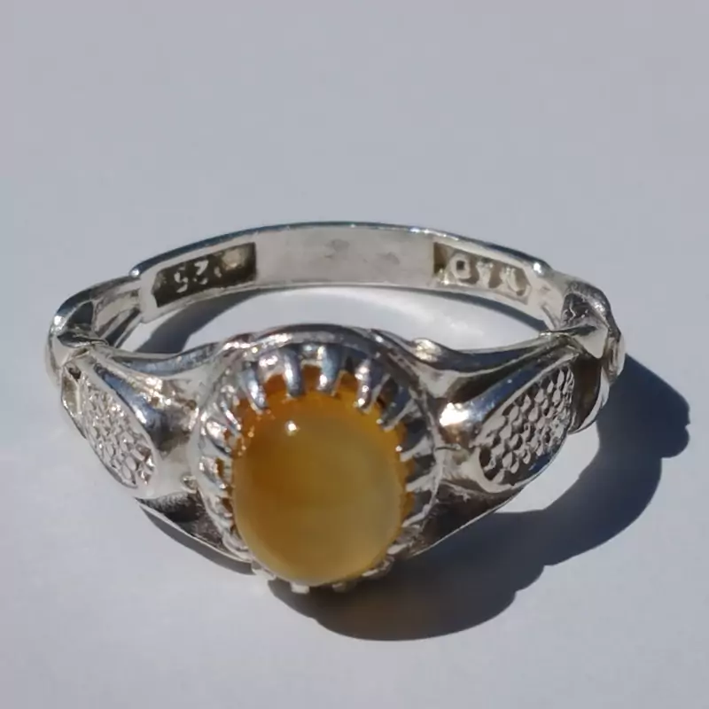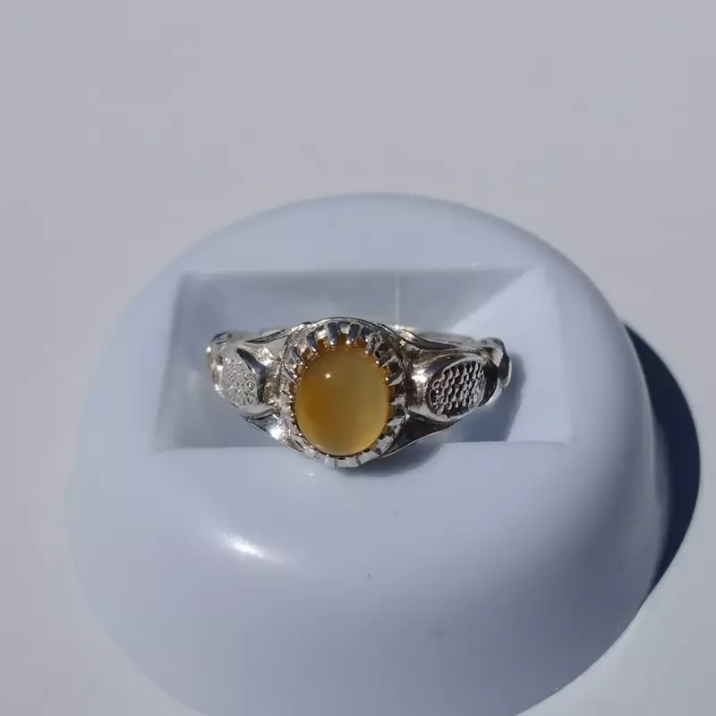 فرم نقره عیار ۹۲۵ عقیق زرد شرف الشمس عقیق صددرصد طبیعی و معدنی میباشد در صورت تمایل ضمانت نامه مکتوب برای اصالت جنس و رنگ عقیق صادر میشود تضمین میکنیم که عقیق وارداتی،ازمایشگاهی،شیشه و .... نبوده بلکه عقیق طبیعی و معدنی است و رنگ آن نیز طبیعی است(مانند بسیاری از عقیق های بازار رنگ نگین تزریقی نیست) تراش نگین توسط هنرمندان مجموعه تولیدی درسیم انجام گرفته است