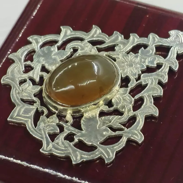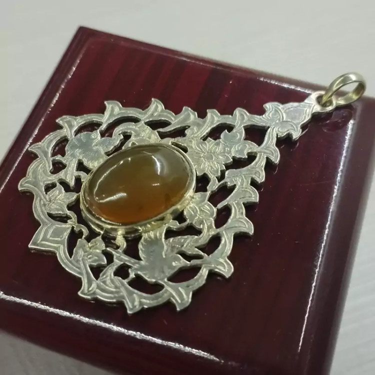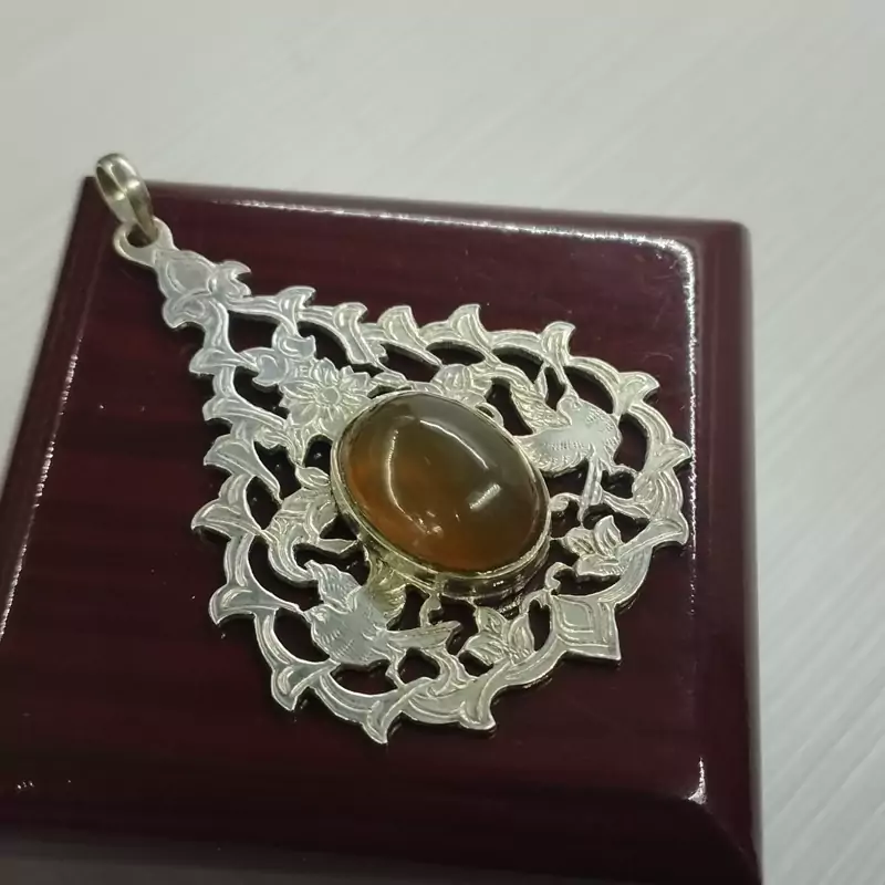 گردن آویز زنانه نقره قلمزنی طرح گل و مرغ عقیق زرد شرف الشمس طبیعی