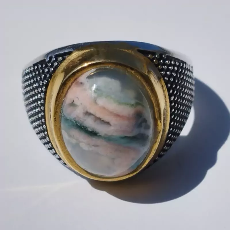 انگشتر مردانه استیل رنگ ثابت عقیق جاسپر آب رنگی بسیار زیبا