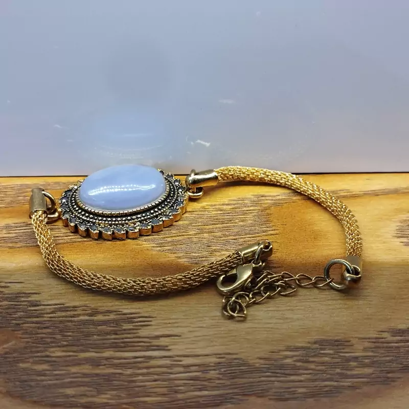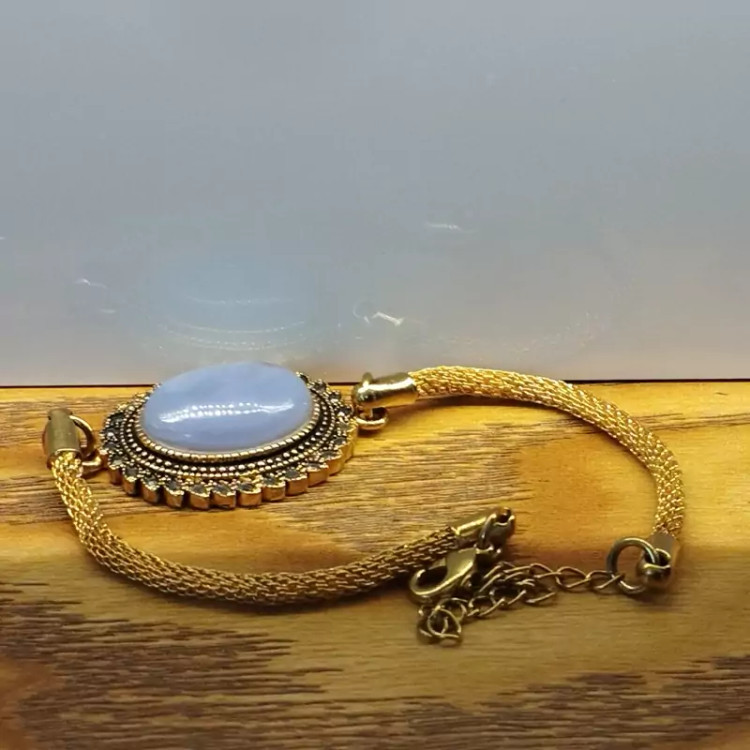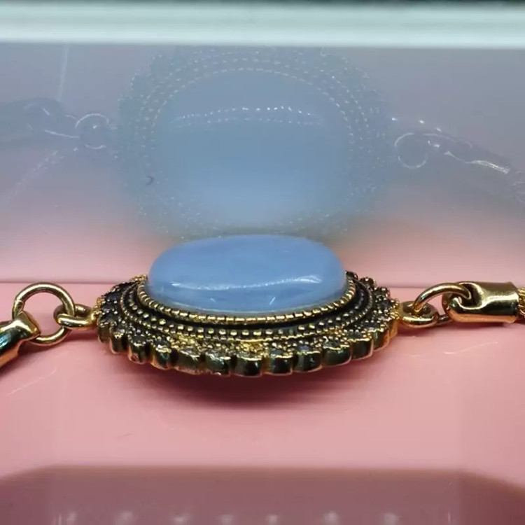 دستبند زنانه مناسب برای همه سنین فرم استیل رنگ ثابت با آبکاری زرد و نگین مارکازیت عقیق صددرصد طبیعی و معدنی آبی کبود 🟣 کلیه عقیق های مجموعه تولیدی دُرسیم با #ضمانت_مکتوب ارایه میگردد ( ضمانت میکنیم که #جنس ، #رنگ و #طرح درون همه عقیق ها #طبیعی و #تراش_بدون_واسطه مجموعه تولیدی دُرسیم از سنگهای خام معادن جنوب خراسان بوده و #وارداتی،#رنگ_شده یا #مصنوعی نمیباشد)