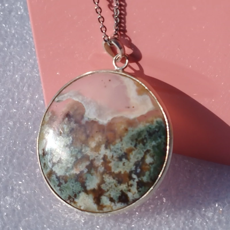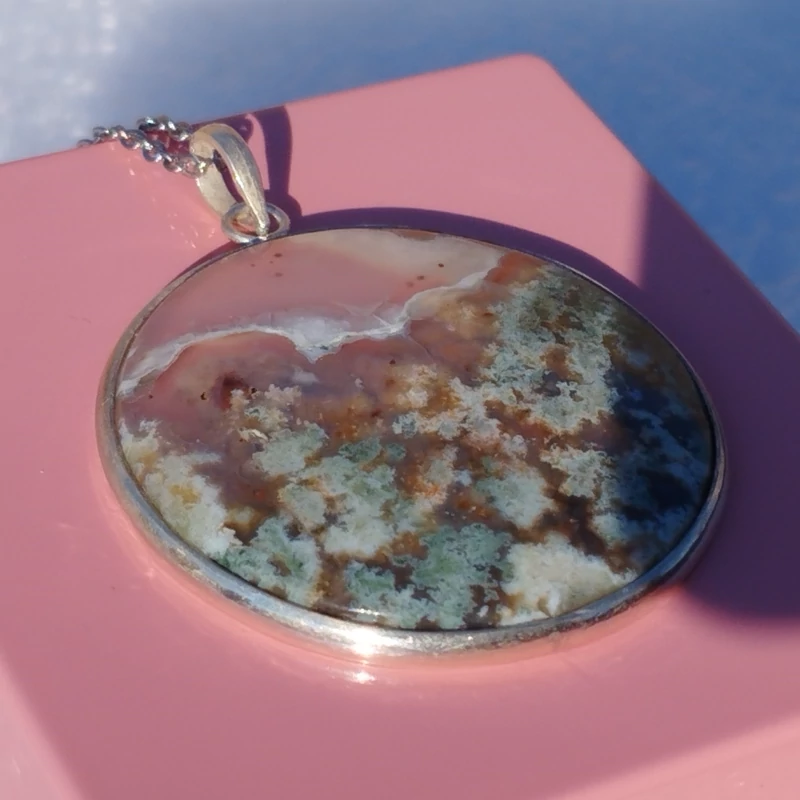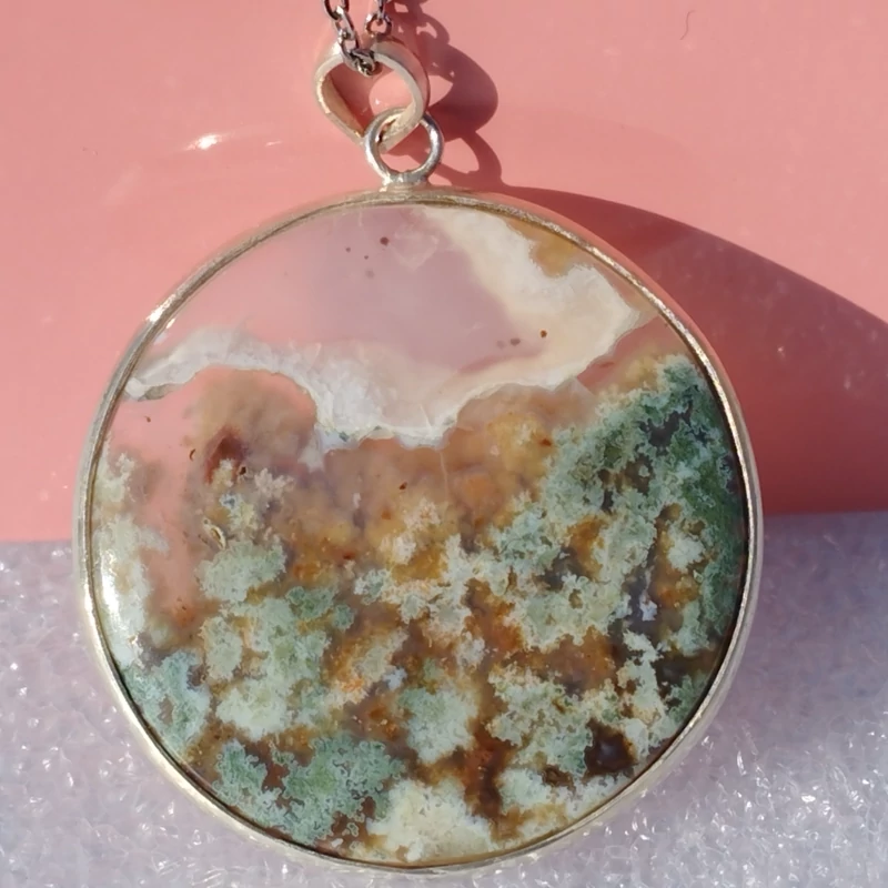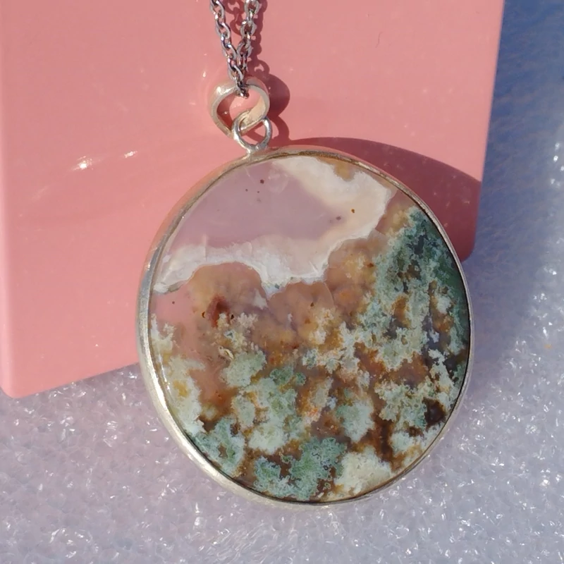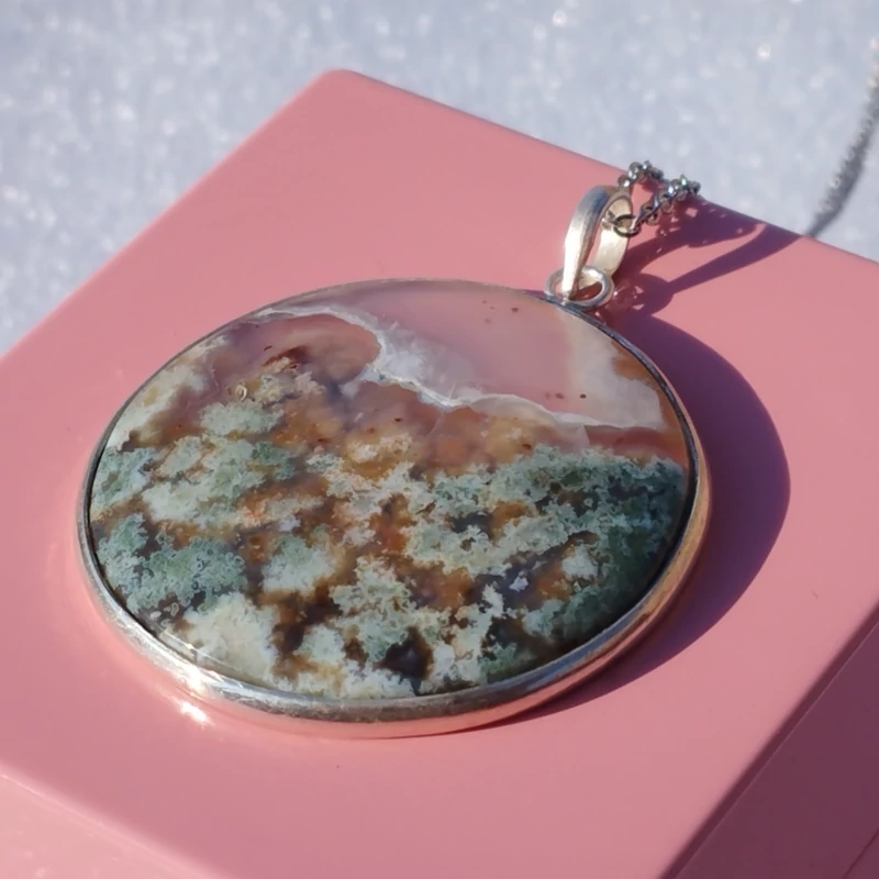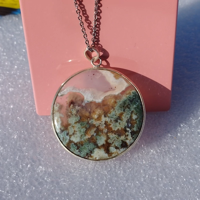 گردن آویز نقره دست ساز زنانه مردانه با عقیق منظره ای سبز پسته ای صددرصد طبیعی و معدنی با ضمانت مکتوب اصالت،برند دُرسیم