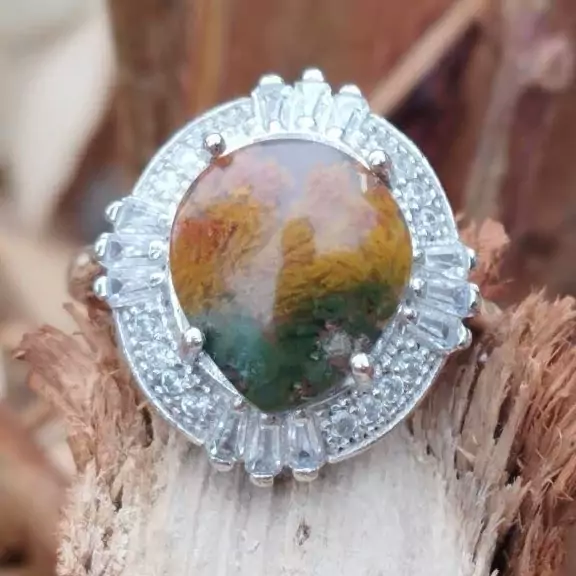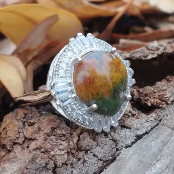 انگشتر نقره زنانه با آبکاری رادیوم و نگین اتمی.عقیق شجر پاییزه طبیعی .با ضمانت مکتوب اصالت.برند دُرسیم