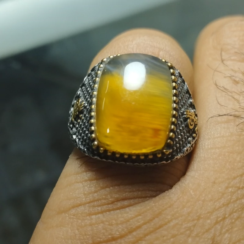 انگشتر استیل عقیق مردانه زرد شرف الشمس طبیعی و معدنی