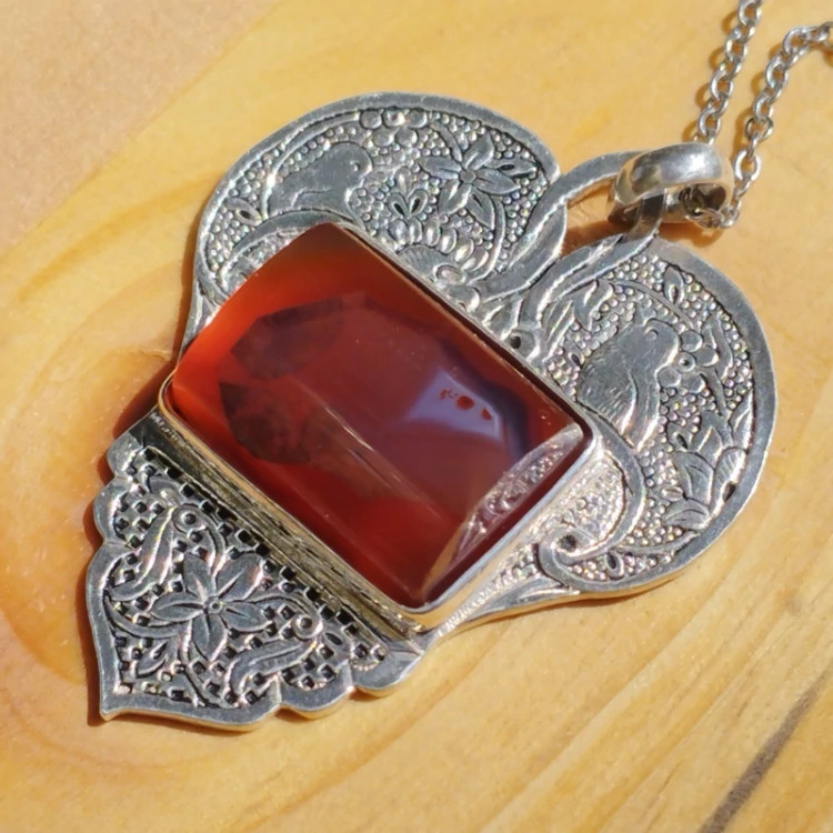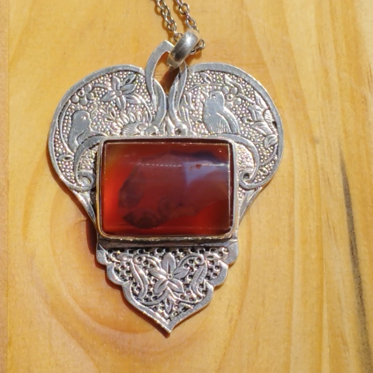 فرم نقره عیار ۹۲۵ قلمزنی طرح گل و مرغ عقیق سرخ طبیعی و معدنی عقیق صددرصد طبیعی و معدنی میباشد در صورت تمایل ضمانت نامه مکتوب برای اصالت جنس و رنگ عقیق صادر میشود تضمین میکنیم که عقیق وارداتی،ازمایشگاهی،شیشه و .... نبوده بلکه عقیق طبیعی و معدنی است و رنگ آن نیز طبیعی است(مانند بسیاری از عقیق های بازار رنگ نگین تزریقی نیست) تراش نگین توسط هنرمندان مجموعه تولیدی درسیم انجام گرفته است