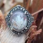 انگشتر نقره زنانه با نگین های مارکازیت و عقیق شجر سفید بسیار زیبای طبیعی در زمینه کبود و ضمانت مکتوب اصالت.برند دُرسیم
