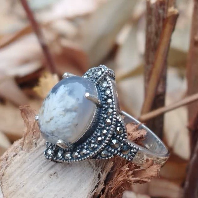 انگشتر نقره زنانه با نگین های مارکازیت و عقیق شجر سفید بسیار زیبای طبیعی در زمینه کبود و ضمانت مکتوب اصالت.برند دُرسیم