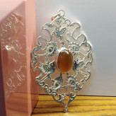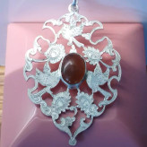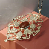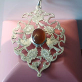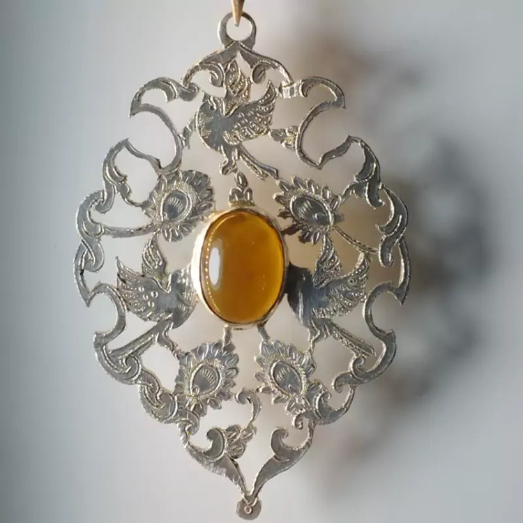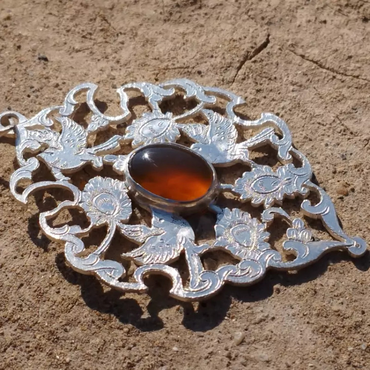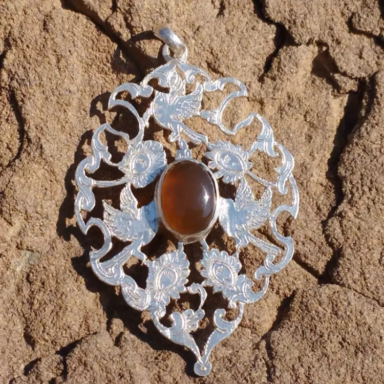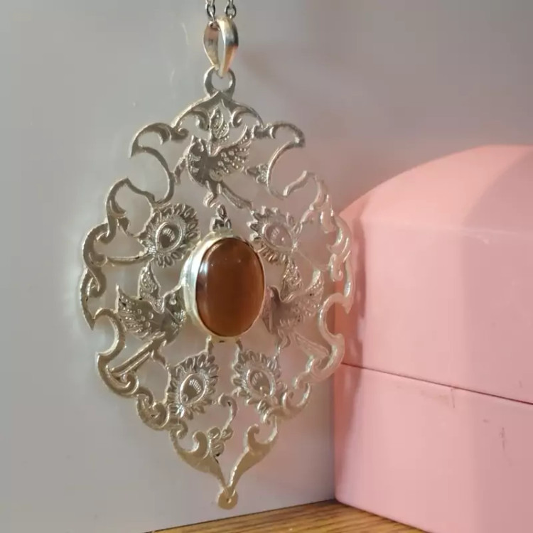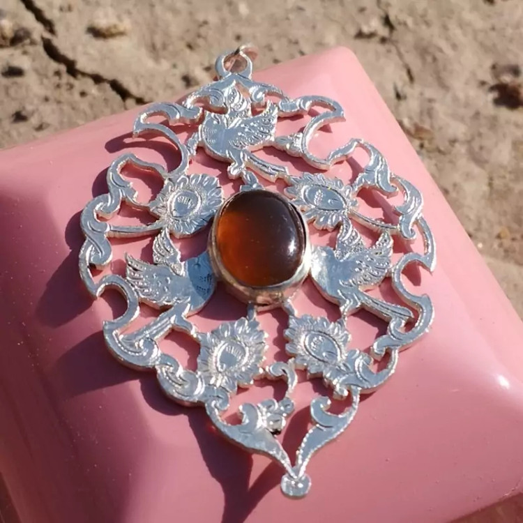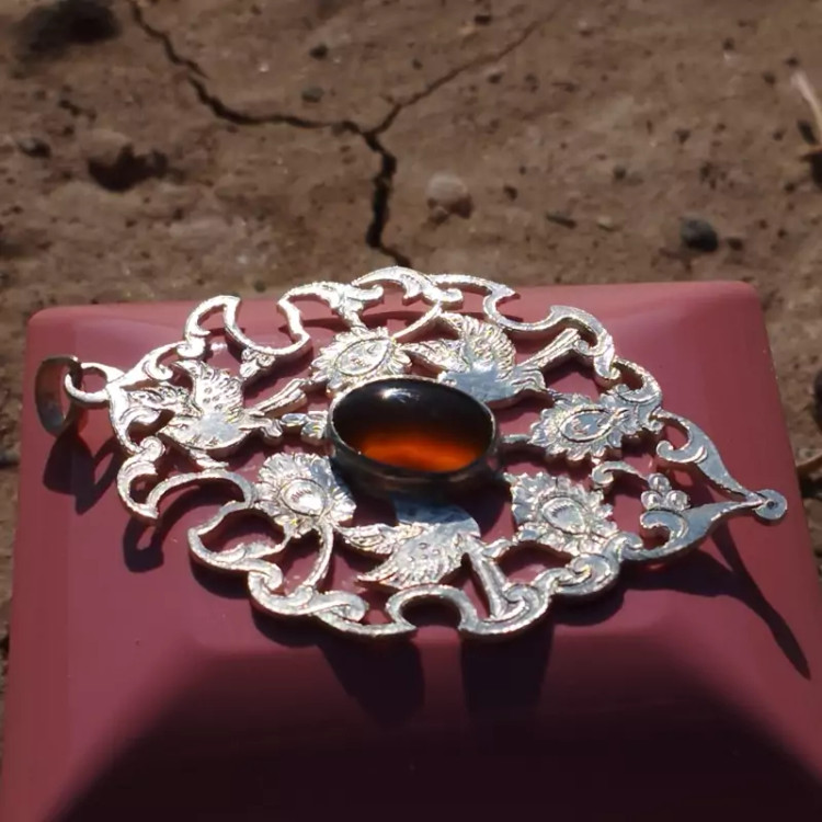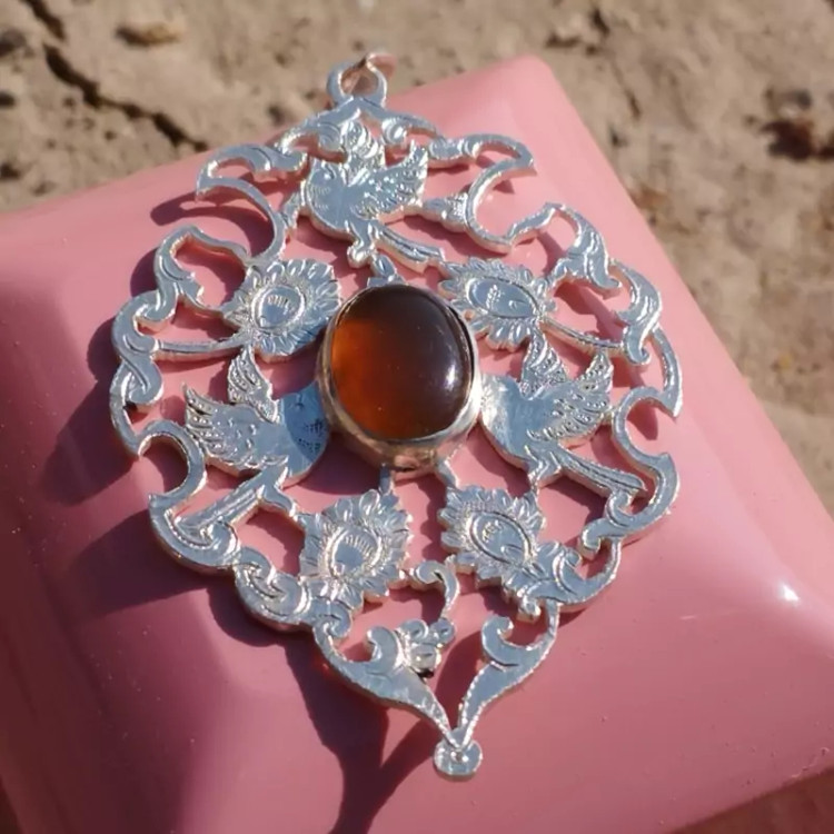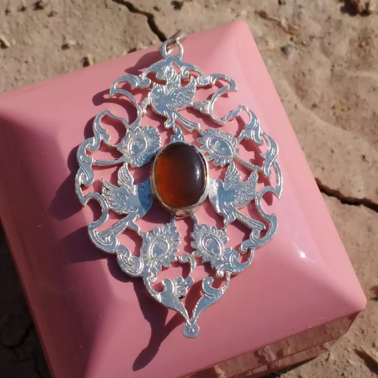 گردن آویز نقره زنانه قلمزنی طرح گل و مرغ عقیق خرمایی صددرصد طبیعی و معدنی با ضمانت مکتوب اصالت،برند دُرسیم