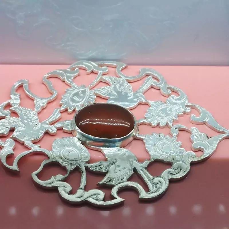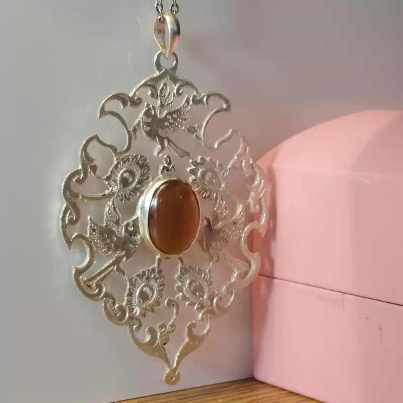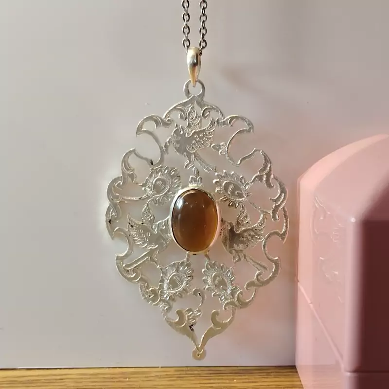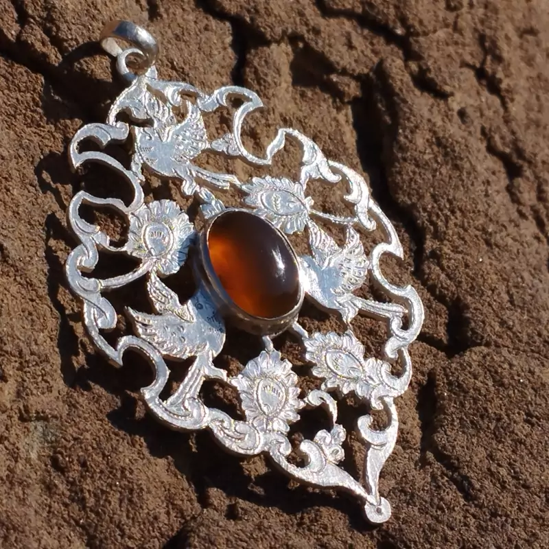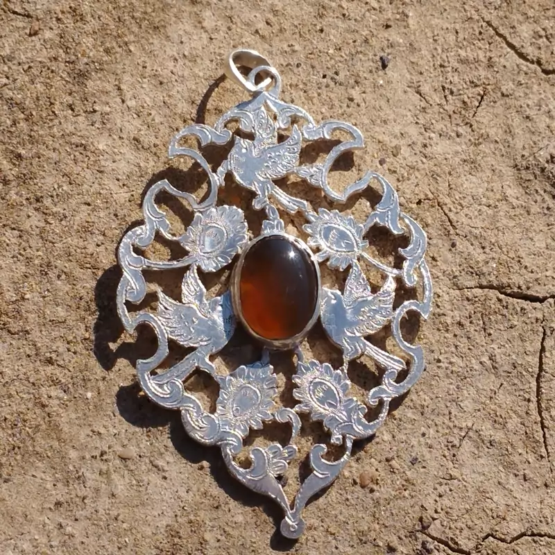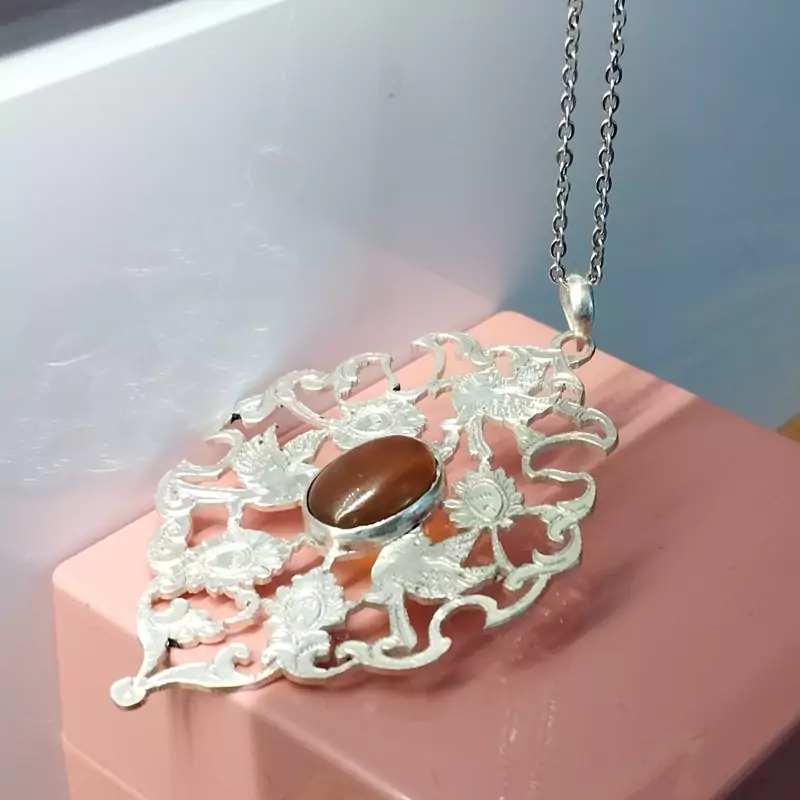 گردن آویز نقره زنانه قلمزنی طرح گل و مرغ عقیق خرمایی صددرصد طبیعی و معدنی با ضمانت مکتوب اصالت،برند دُرسیم